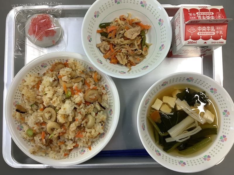 今日のメニューは、ツナちらし寿司、豚肉の細切り炒め、糸かまぼこのすまし汁、伊賀まんじゅうです。