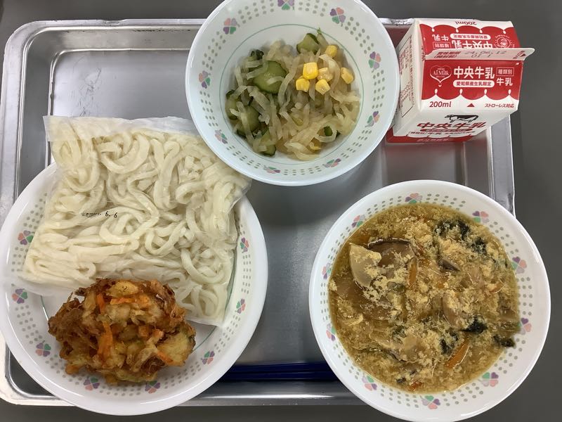 今日のメニューは、かき玉うどん、手作りかき揚げ、大根サラダです。