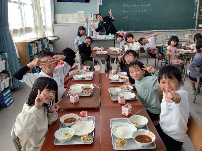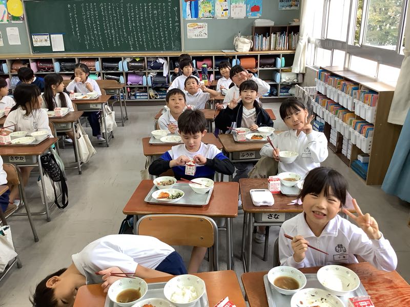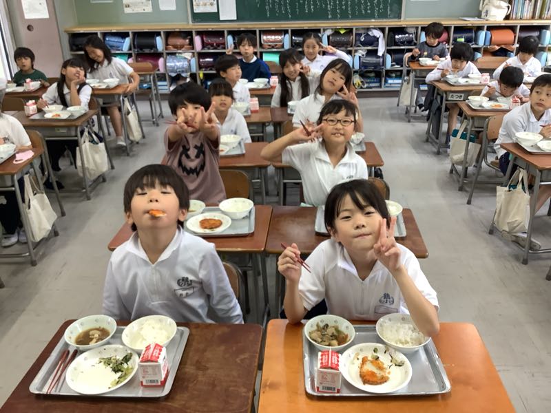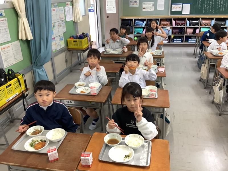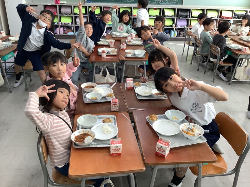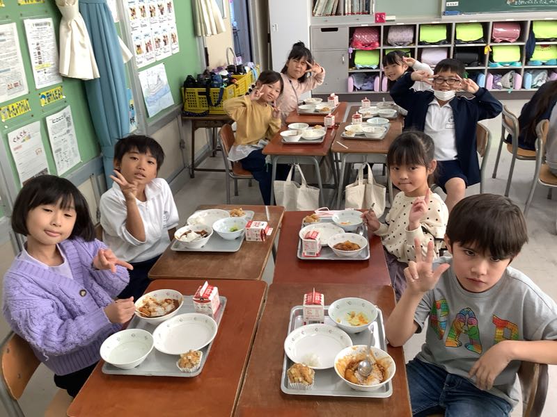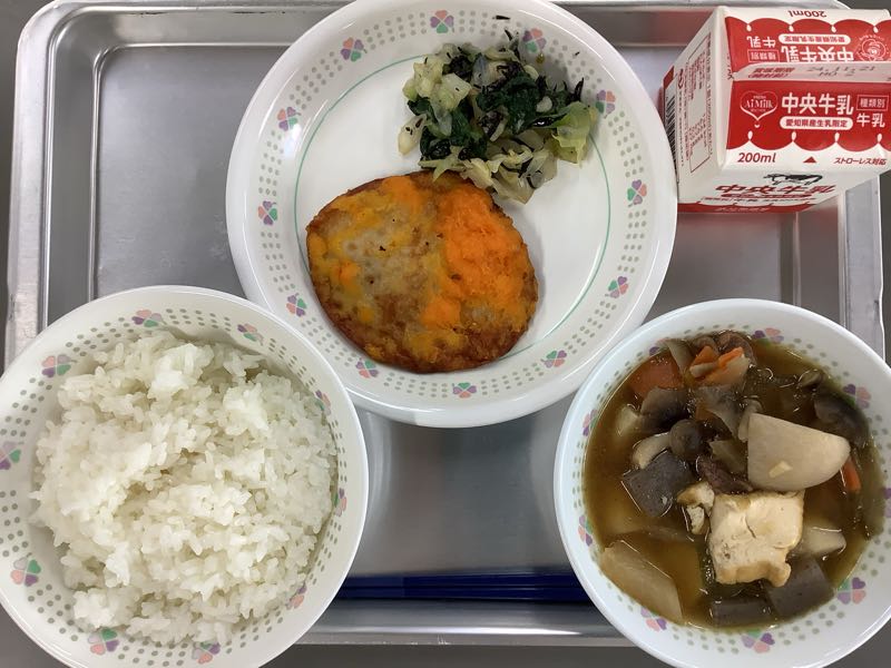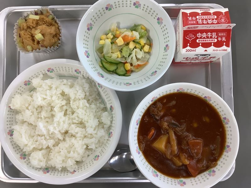 今日のメニューは、ミートソースのソフト麺、ビーンズサラダ、さつまいもとじゃがいものチップス、牛乳です。