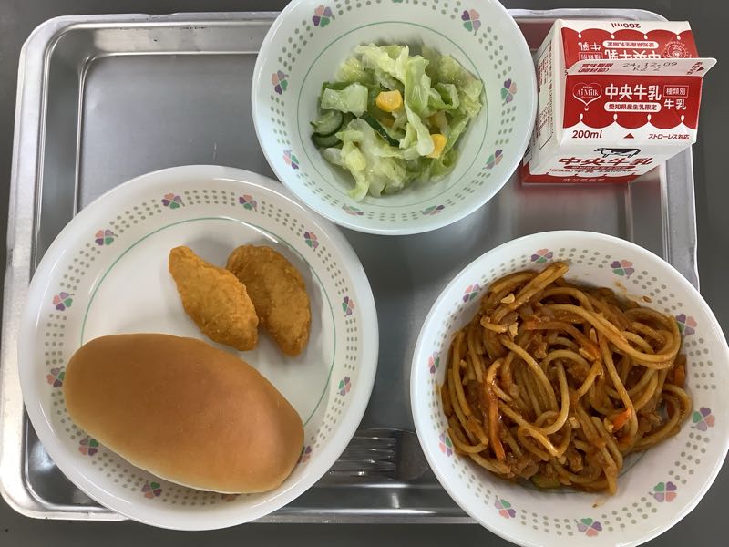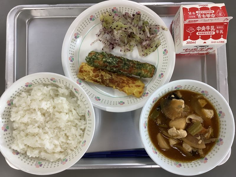 今日のメニューは、プルコギまぜごはん、春雨サラダ、キムチスープ、牛乳です。