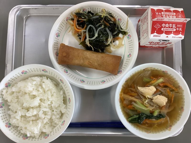 今日のメニューは、手作り春巻き、わかめのナムル、春雨スープです。手作り春巻きは、中の餡がとろりとして、サクッとした皮と絶妙なマッチングです。