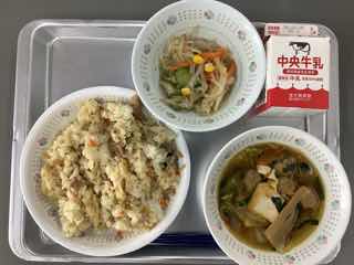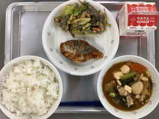 今日のメニューは、ハンバーグのデミグラスソースかけ、野菜たっぷりスープ、ポテトサラダ、ごはん、牛乳です。
