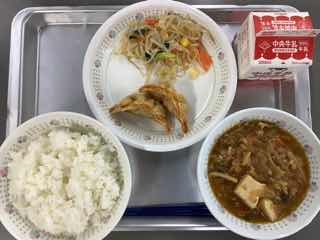 今日のメニューは、揚げぎょうざ、麻婆豆腐、中華サラダです。