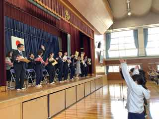 今日の5時間目に退任式がありました。鶴城小学校で昨年度まで勤めていただいた教職員の皆さんが、お別れの挨拶に来てくださいました。