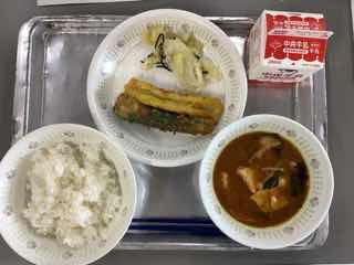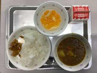今日のメニューは、ポークカレー、福神漬、フルーツあえです。ポークカレーのホクホクのじゃがいもによって、食欲がさらに増します。