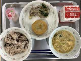 今日のメニューは、赤飯、食育トリオのメンチカツ、ゆかり和え、かき玉汁、ミニお祝いゼリーです。今週の火曜日から1年生も給食が始まっています。お祝いメニューとしてのラインナップです。