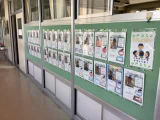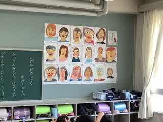 みんなよく噛んで食べていました。教室には家族の顔の絵が、廊下には自己紹介が掲示されていました。今週の授業参観に、ぜひご覧ください。