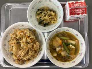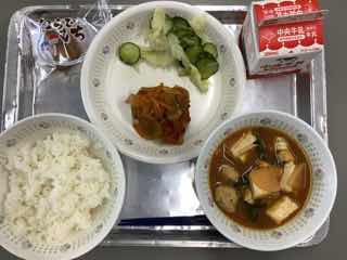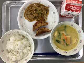 今日のメニューは、揚げぎょうざ、豚肉ときゃべの味噌炒め、豆乳入り中華スープです。