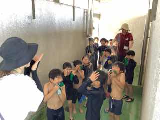 4年生は、プール利用の仕方や約束の説明を涼しい多目的室で行い、すぐにシャワーを浴びました。