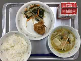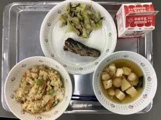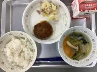 今日のメニューは、ハンバーグの玉ねぎソースかけ、ベーコンポテト、野菜たっぷりスープです。