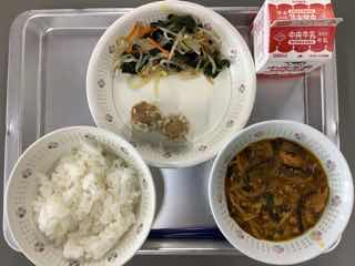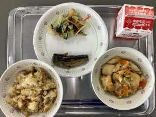 今日のメニューは、したじ飯、イワシの梅煮、昆布和え、大根のそぼろ煮です。