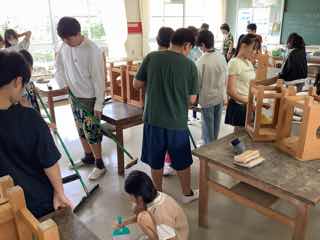 図工室はエアコンが入り、快適に板をほることができますが、あとで使うクラスのために、念入りに掃除までするのが授業です。