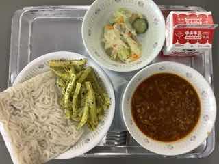 今日のメニューは、夏野菜マーボー、シュウマイ、中華サラダです。