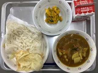 今日のメニューは、カレー南蛮、ポテトチップス、カボチャサラダです。