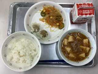 今日のメニューは、しゅうまい、春雨サラダ、マーボー豆腐です。春雨サラダやマーボー豆腐がピリ辛で、ご飯が進みます。