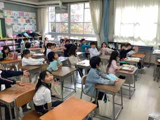 かたりべそよかぜ組さん、5名が来校され、2クラスごとで聞きました。