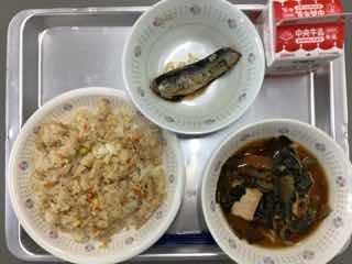 今日のメニューは、鶏そぼろご飯、イワシのしょうが煮、サツマイモの味噌汁です。