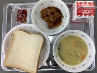 今日のメニューは、白菜のクリームスープ、ミートボールのケチャップ煮、スライスパン、いちごジャムです。