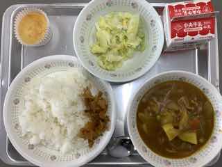3学期はじめの給食のメニューは、ポークカレー、コールスローサラダ、福神漬け、オレンジレモンケーキです。