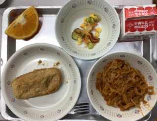 今日のメニューは、きなこ揚げパン、ミートソーススパゲッティ、カラフルサラダ、いよかんです。