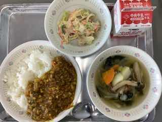今日のメニューは、キーマカレー、スパゲッティサラダ、コンソメスープです。