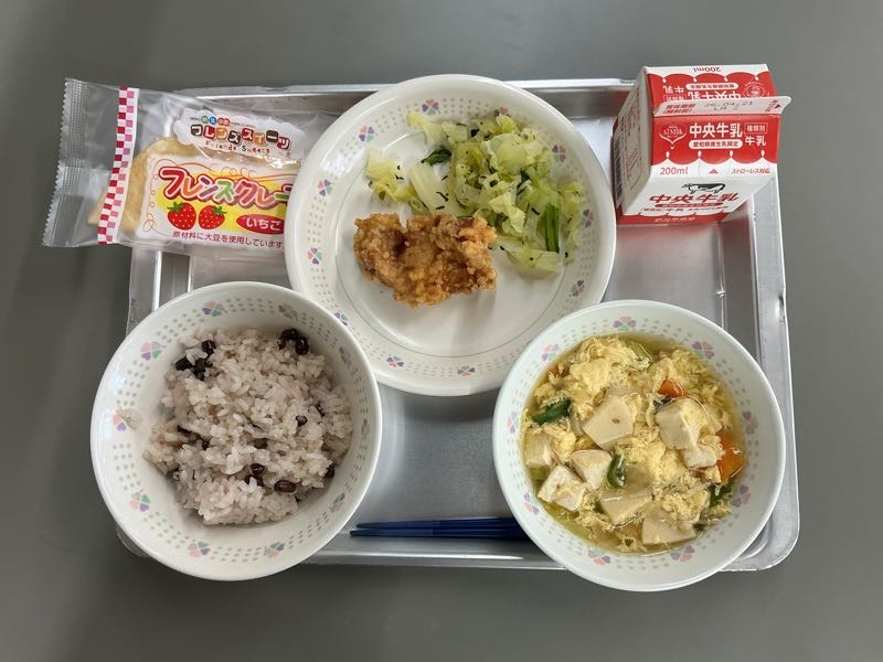 今日のメニューは、赤飯、牛乳、から揚げ、青菜あえ、かき玉汁、クレープでした。1年生の入学をお祝いしたお祝い給食です。