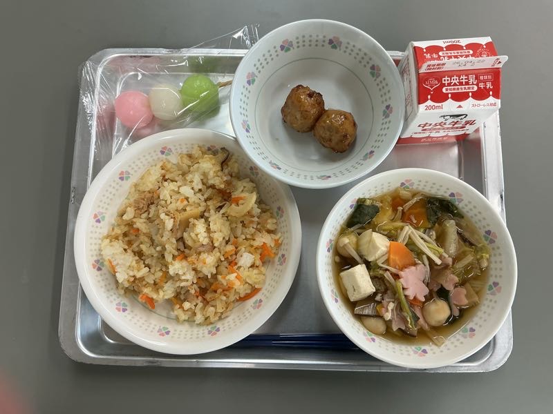今日の給食メニューは、ツナちらしずし、牛乳、ゴボウつくね、すまし汁、花見だんごです。今日も季節を感じる給食を味わいました。