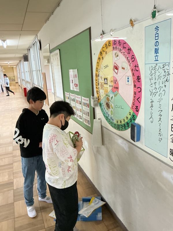 1階の廊下では、給食委員会の子が、献立の掲示をかえていました。