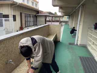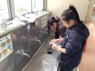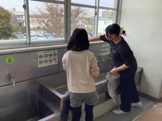 掃いたり拭いたりして、もとに戻します。手洗い場では、石けんかすや泥の汚れを擦って落とします。