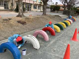 遊具や看板に丁寧にペンキを塗ったり
