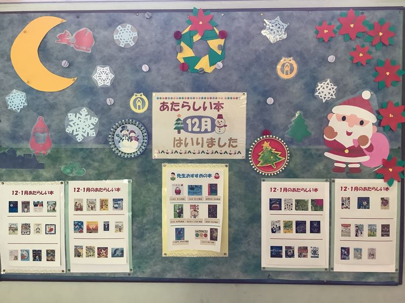 廊下を歩いてみると、図書ボランティアさんによる12月の掲示。新しく入った本の紹介と先生たちのオススメの本の紹介も更新されています。