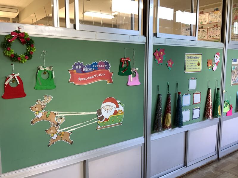 3階では、クリスマス飾りを作った折り紙クラブの作品や、保健室前は寒さに負けない健康な生活についての掲示にかわっています。
