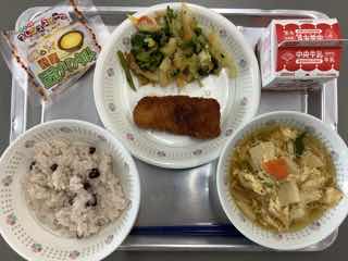 赤飯、イカフライのレモン煮、菜の花和え、かき玉汁、豆乳プリンタルトです。