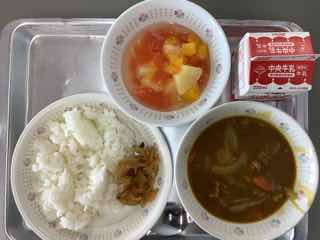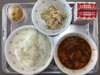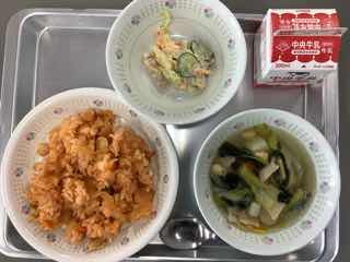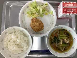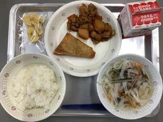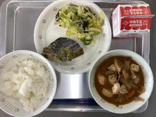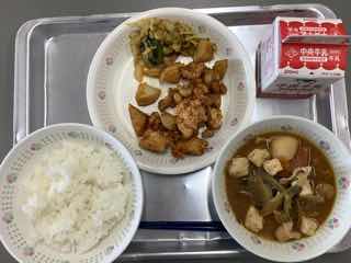 今日のメニューは、豚汁、おかか和え、鶏肉とじゃがいものからめ煮です。
