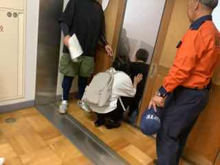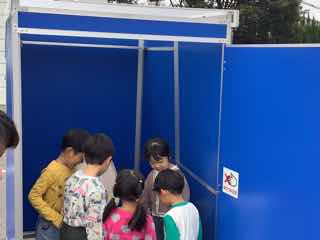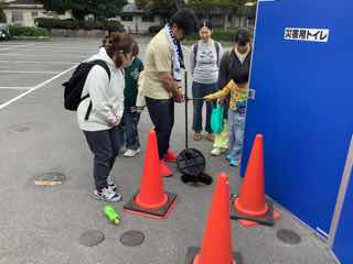 避難所で一番大事なトイレの説明を受けています。実際にマンホールの中を確認しました。
