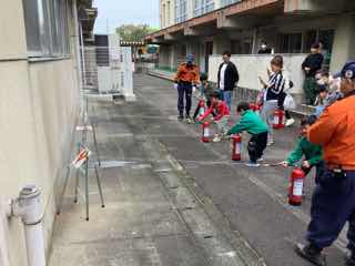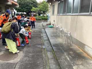 消火器体験です。「火事だー」と周囲に言いながら、消火活動を行うことが大切です。