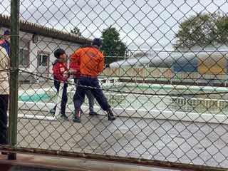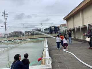 放水体験です。腰を落とし、しっかりと持つことが大事です。「振動がすごい」という感想がありました。