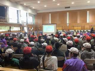 5年生児童会役員は、事前に6年生にアンケートを取り、それを元にした思い出クイズを出しました。6年生は、赤白帽子の色でクイズに答えました。学習発表会の6年生の発表を思い出させるクイズに大変盛り上がりました。