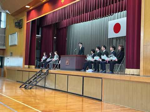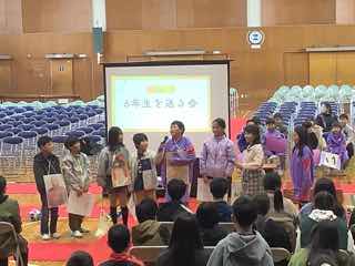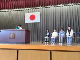 児童代表が、この一年で頑張ったことを発表しました。行事や学習、生活で力を入れてきたことや達成できたことを自分の言葉で全校に伝えました。また、この一年でつけてきた力をもとに、次の学年で頑張りたいと話しました。この一年で輝く姿があった人が立派な姿で発表しました。