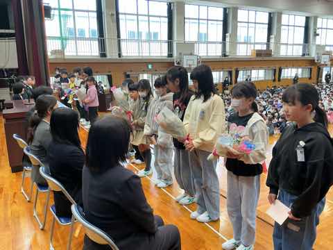 代表児童が手紙と花束を渡すときには、「ありがとうございました」とお互いに笑顔で伝え、良いお別れができました。