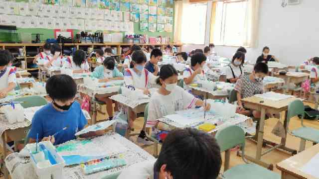 色塗りの練習では、校舎の陰影をどう塗ろうかな、と工夫を考えながら塗る姿が見られました。