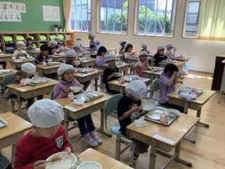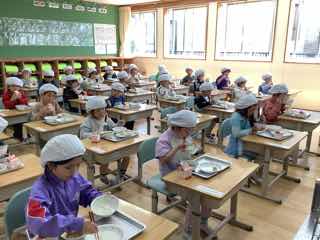 昨日から給食が始まりました。「先生、給食楽しみ。」と、笑顔で話す子どもたち。「給食ってこんなに美味しいんだね。」と、食べ終わった後に話す子どもたち。栄養満点の給食を、みんなで楽しく食べることができました。
