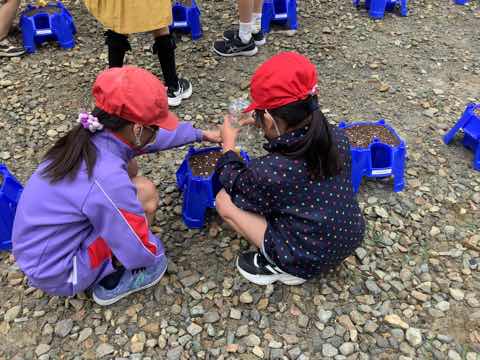 6年生に手伝ってもらい、朝顔の種を植えました。「大きくなってね。」「元気に育ってほしいな。」「一生懸命お世話をするからね。」綺麗な花が咲くように、毎日お世話をしていきます。