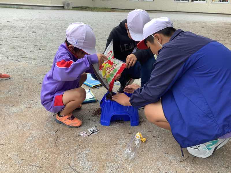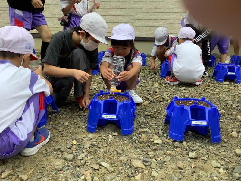 6年1.2.5組が1年生のアサガオの種を植える手伝いをしました。ペアの子と仲を深めながらも、しっかりお兄さん、お姉さんとしてサポートしました。