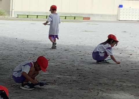 生活「あきをみつけよう」南庭に秋を見つけに行きました。「どんぐりが落ちているよ。」「赤い葉っぱがある!」「雲が夏の時と違う気がする。」嬉しそうに写真を撮っていました。