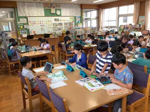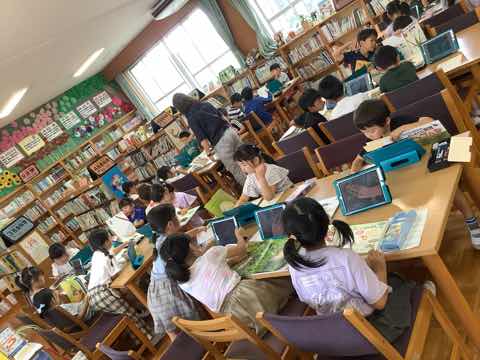 図書館では、運動場で見つけたいきものを調べました。「どんなところに住んでいるのかな。」「何を食べるのかな。」「この前写真を撮った蝶は、なんという名前かな。」疑問を解決するために、いろいろな図鑑や本を読んで調べました。