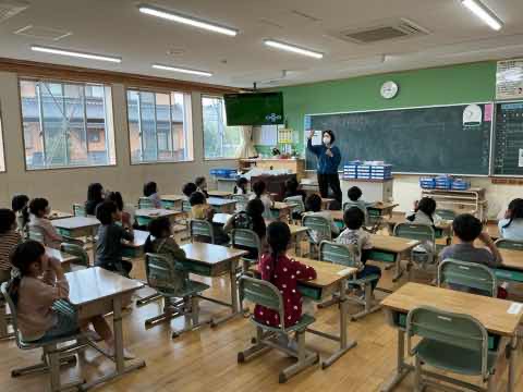 「こえのものさし」については意識するよう繰り返し声をかけています。「ありさんの声はどんな声だった。」と問いかけると、つぶやくような小さな声で話す子供たち。相手に伝わる声の大きさで話せるように練習しています。
