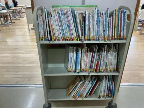 1年生の廊下にはみんなで読む本のブックトラックがあります。はじめはぐちゃぐちゃに戻されていた本が、最近はきれいに整頓されています。一人ひとりが次に読む人のことを考えて片付けていること、向きが違うと気づいて直してくれる子がいること、やさしい子がいっぱいでうれしいです。