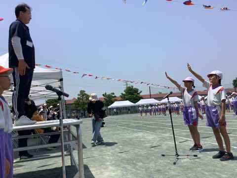 3部制で行う矢田小学校の運動会では、開会式が3回、選手宣誓も3回あります。本日3回目の開会式で、中学年の代表児童2名が運動場に響く爽やかな声で宣誓しました。