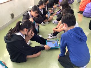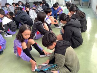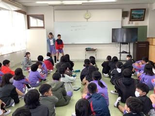 22日、6年3組が総合学習で作った「修学旅行のまとめ」を5年3組に紹介しました。